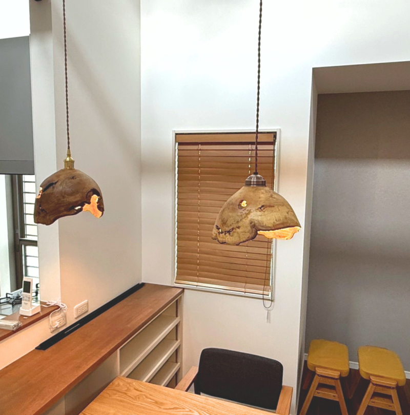 ダイニングのペンダントライトにも木材を用いたものを選ばれるなど、天然素材を大切にされているオーナー様。
