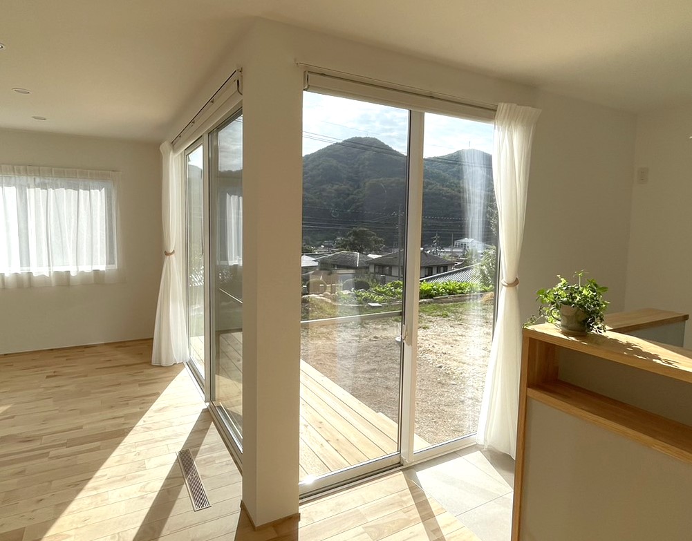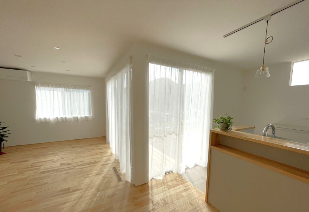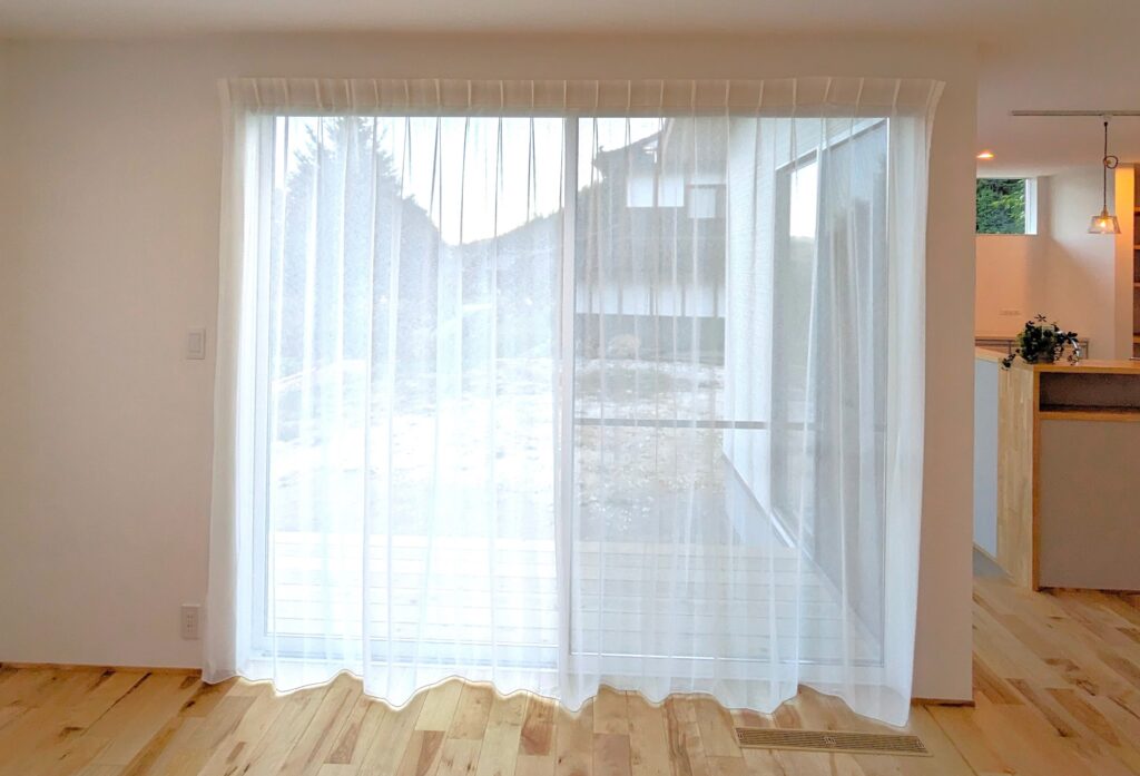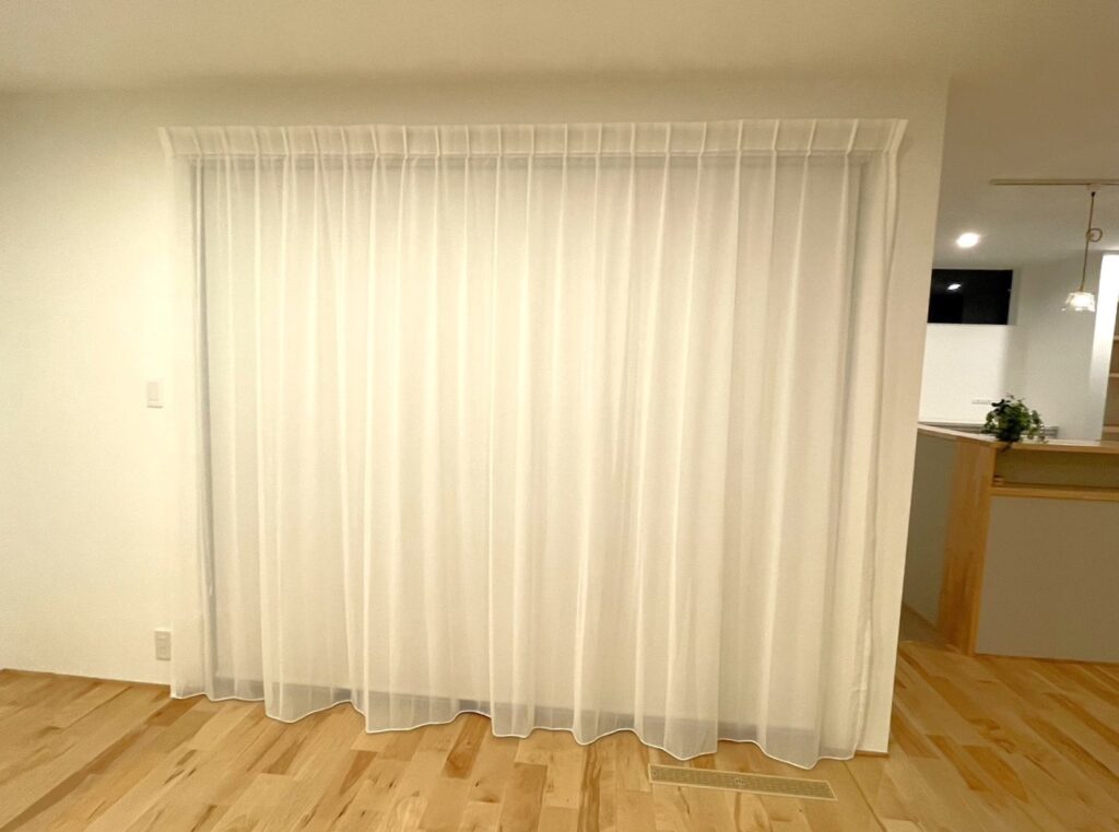 ほどよい透け感のあるカーテンで、明るくて開放感のあるようなリビングにしたい。