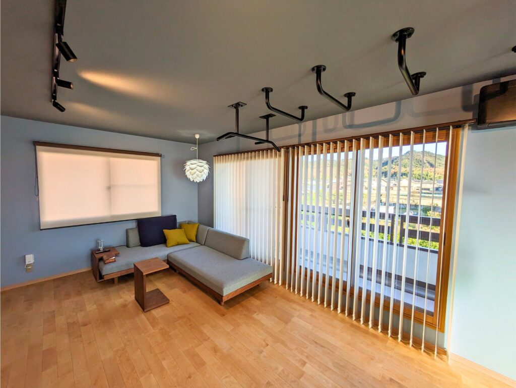 リビングのメイン、壁一面の大きな掃出窓にはすっきりしてスマートな印象のバーチカルブラインドを。