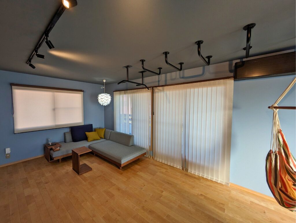 二連の掃出し窓をすっきりと彩る、スタイリッシュな仕上がりとなりました。