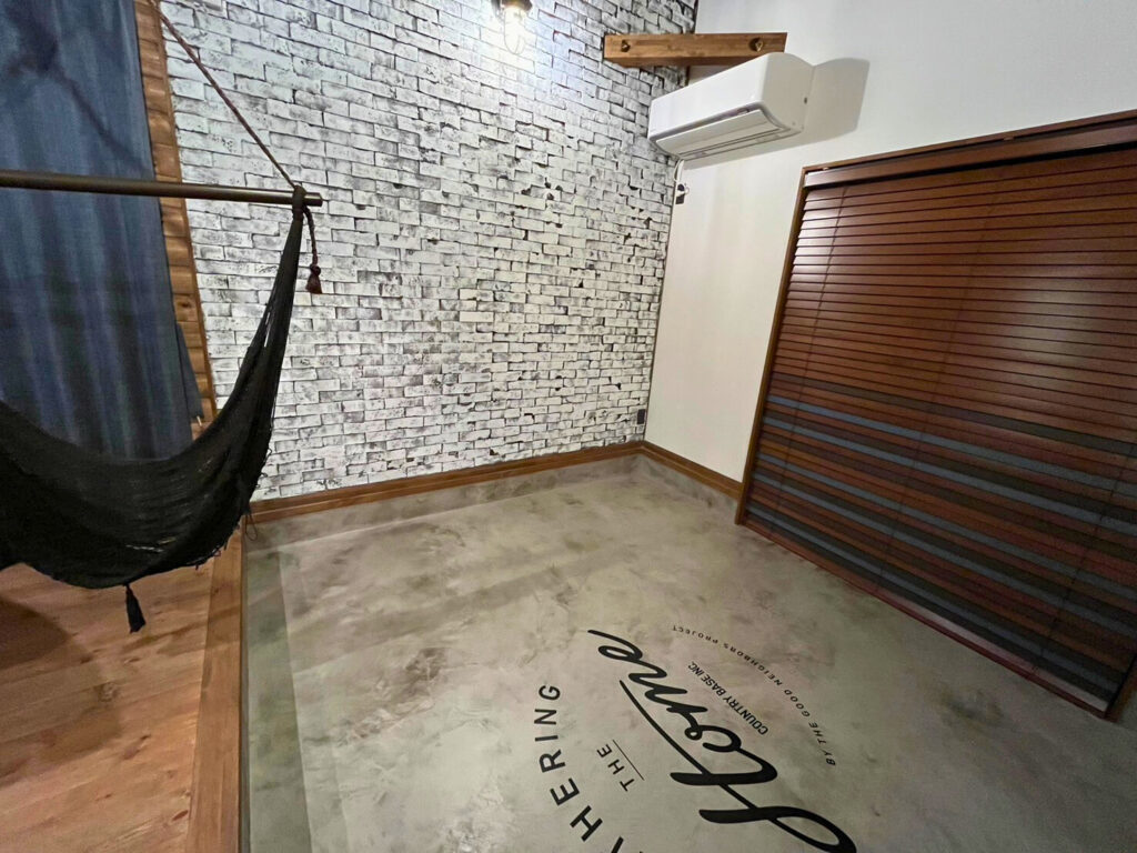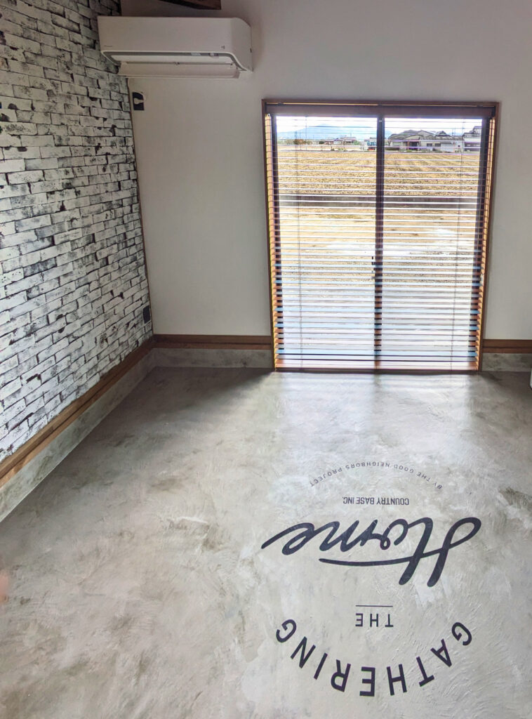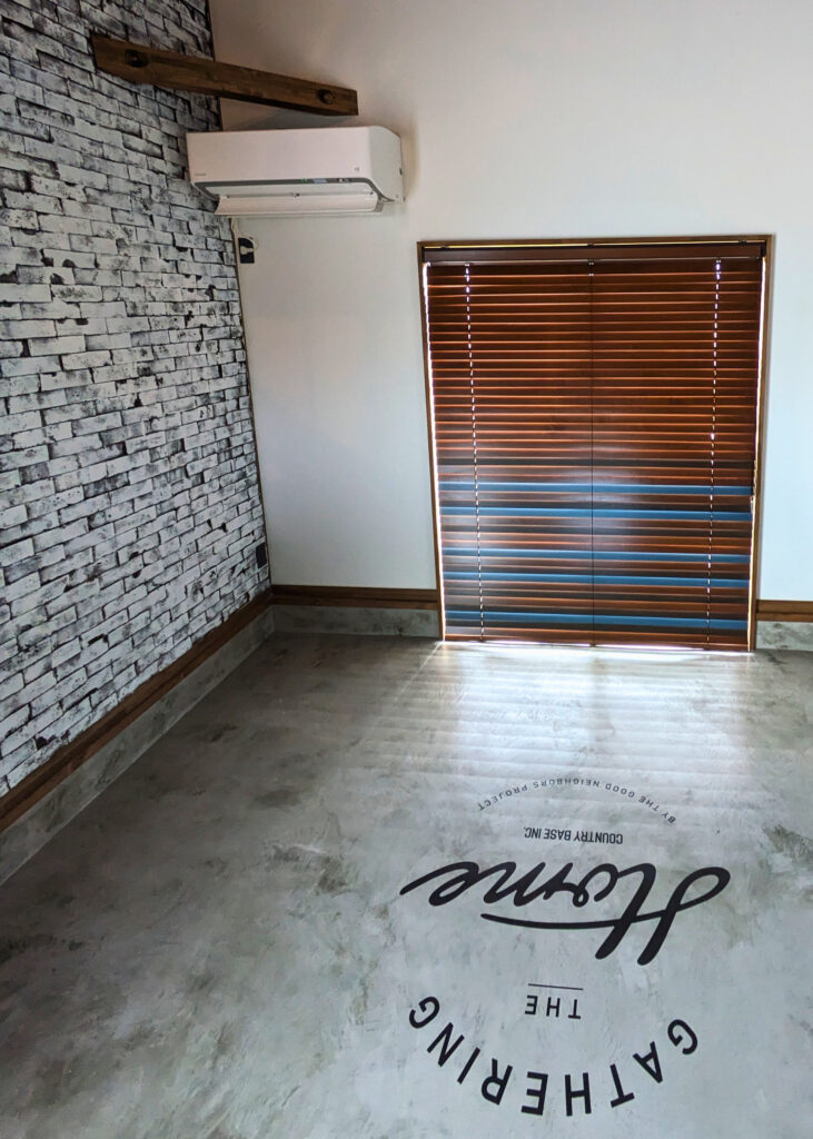 デニム調の生地が羽目板やレンガの重厚感にライトなカジュアルさを追加してくれています。