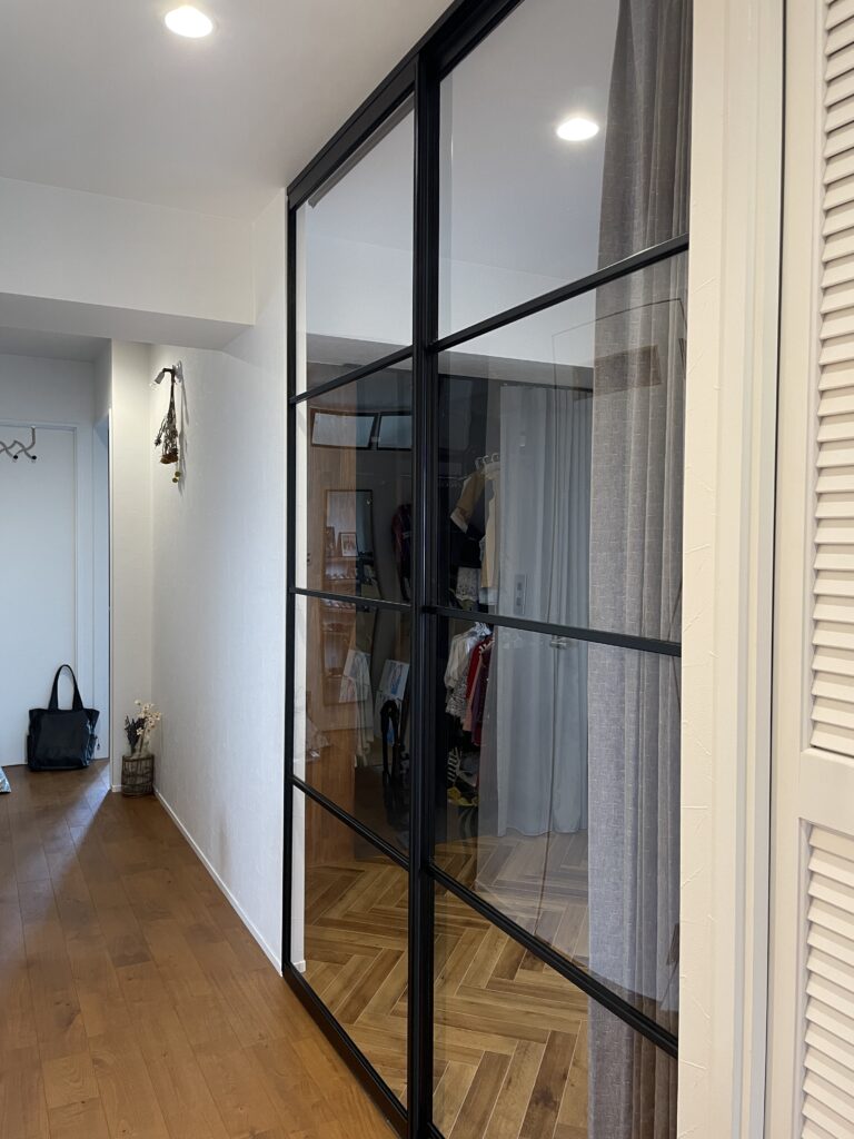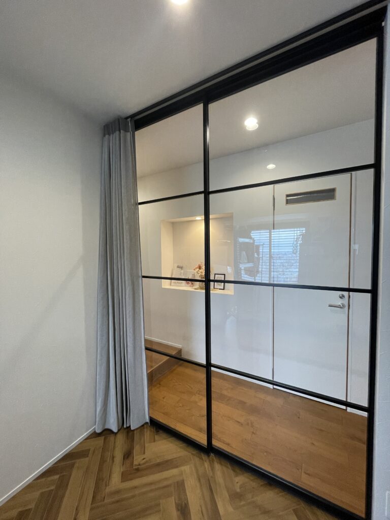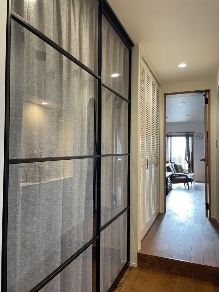 クリアガラスの引き戸に、あえてナチュラルで軽やかな風合いが引き立つレース生地の組み合わせ。