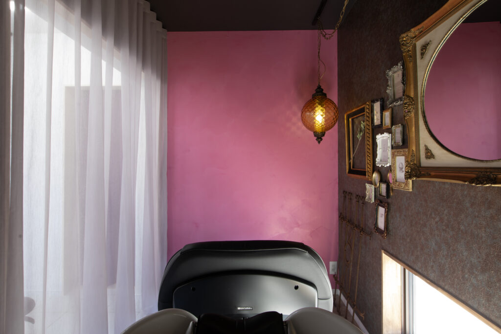 スパルームとの仕切りにはナチュラルな風合いのボイル生地のカーテンをコーディネートしました。