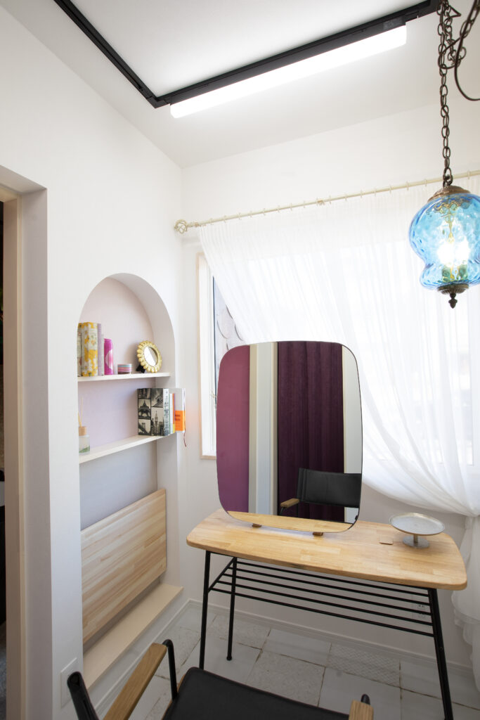 鏡の向こうのレースカーテンは、とろりとした落ち感が魅力のジョーゼット生地です。