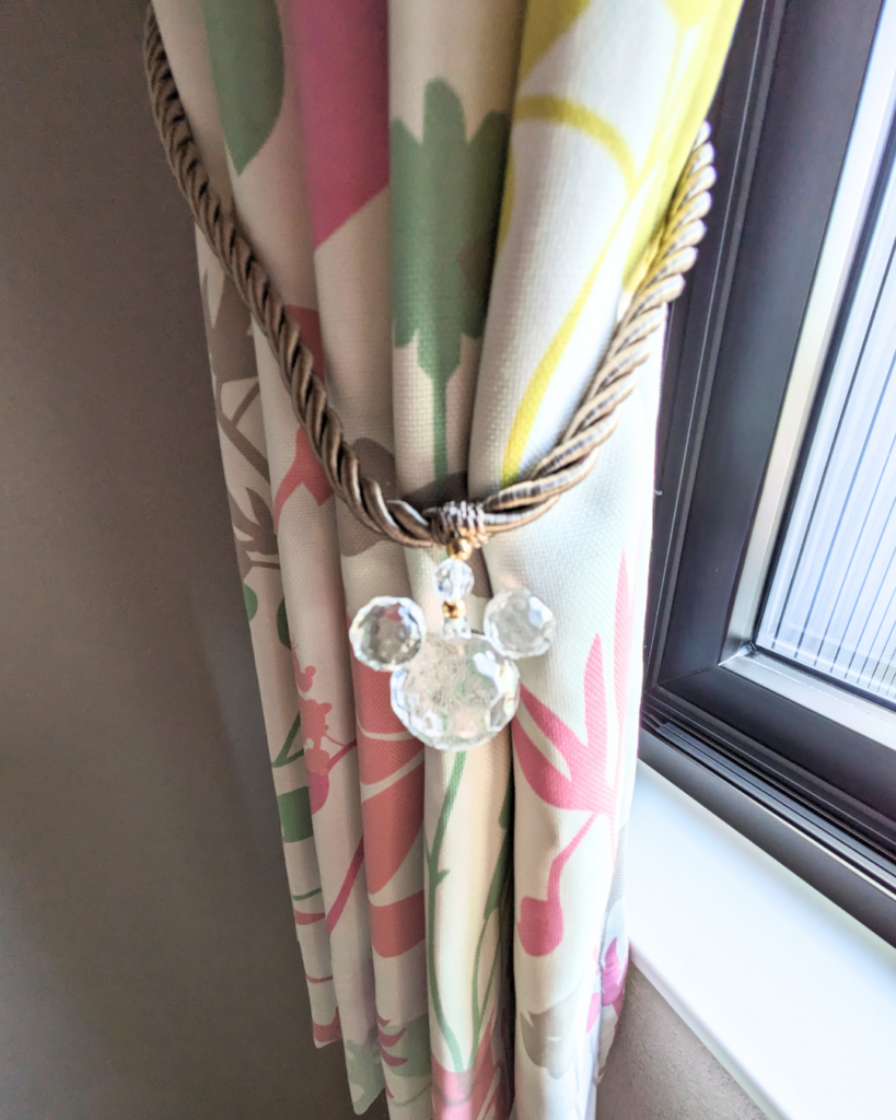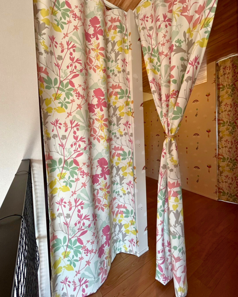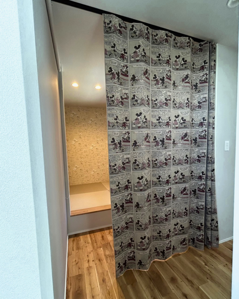 ディズニー柄のカーテンを華やかな間仕切りに