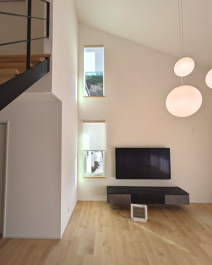 小窓のロールスクリーンには木目の正面カバーをつけることで、大きな壁面の程よいアクセントになりました。